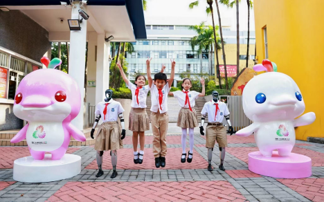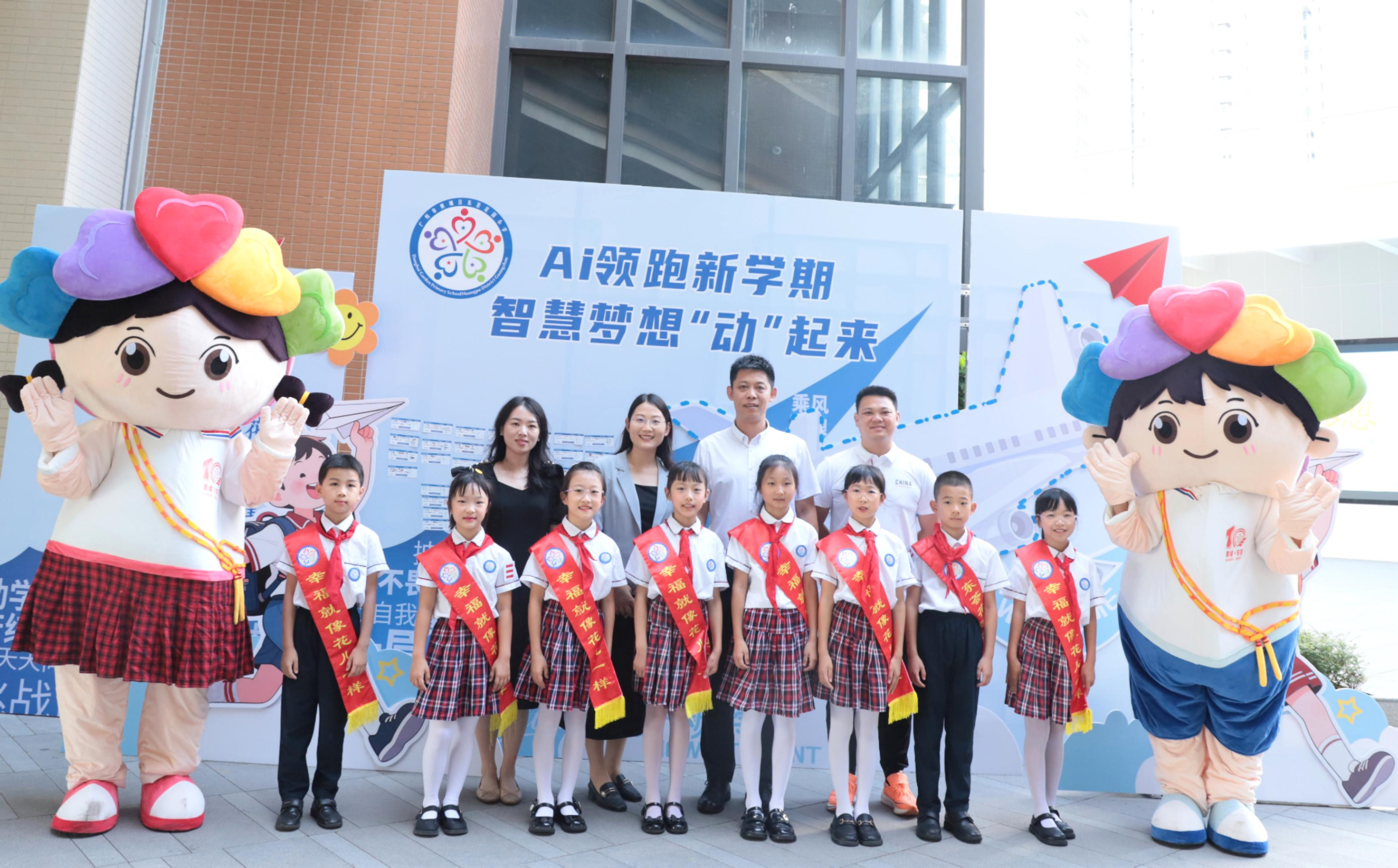 9月1日,华南师范大学附属小学校门口,第十五届全运会吉祥物“喜洋洋”“乐融融”与智能机器人“美美”“好好”一道迎接全校师生。学校教师与吉祥物、机器人一起,用温暖的问候开启新学期。