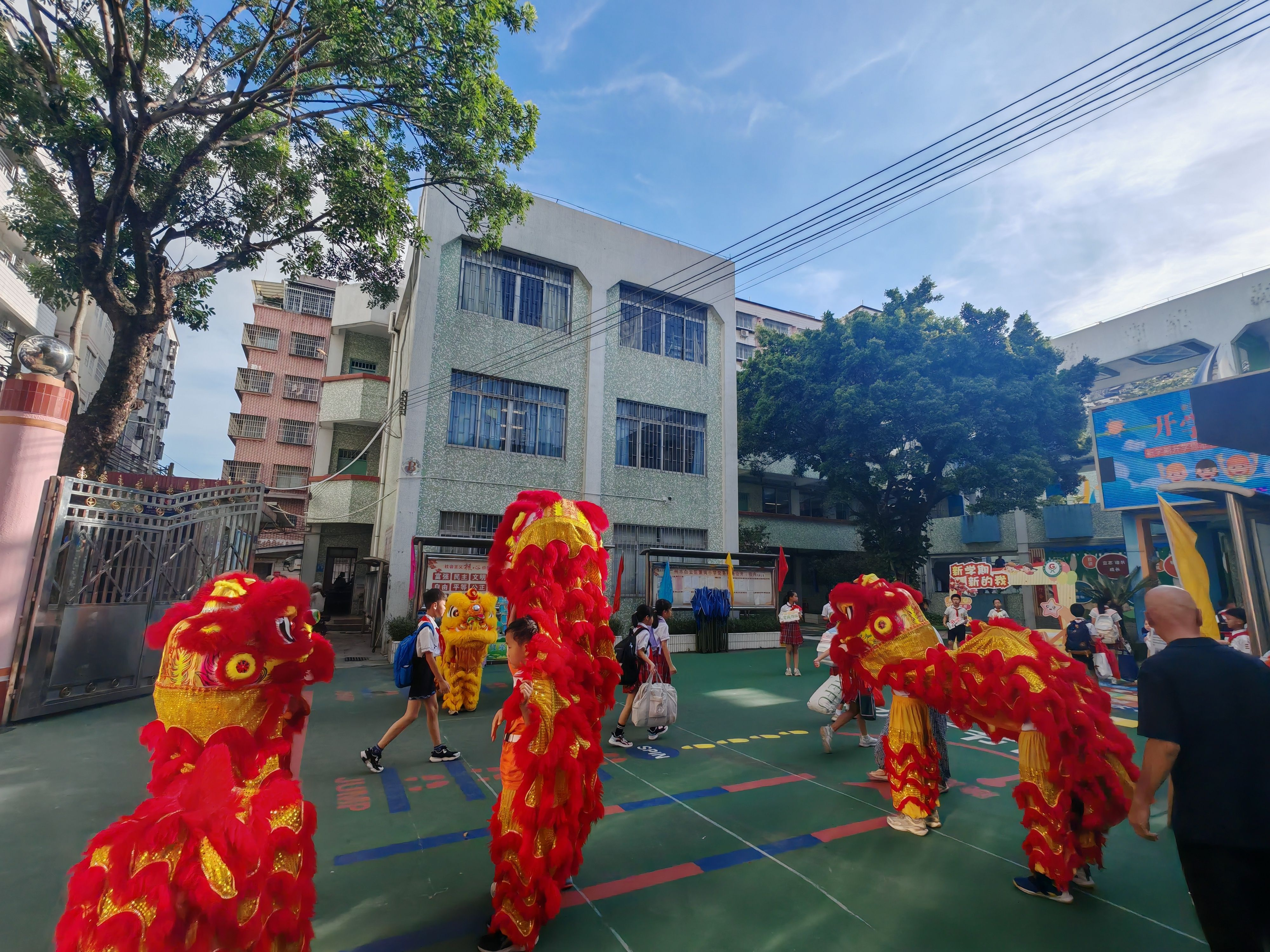 舞龙舞狮队迎接师生进校园
