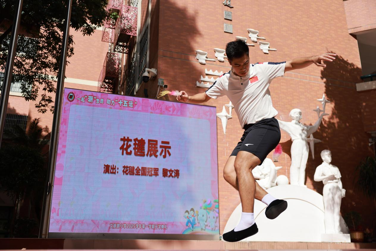 全国花毽冠军黎文涛来到校园,并邀请3名学生上台学习踢毽动作,传授技巧。