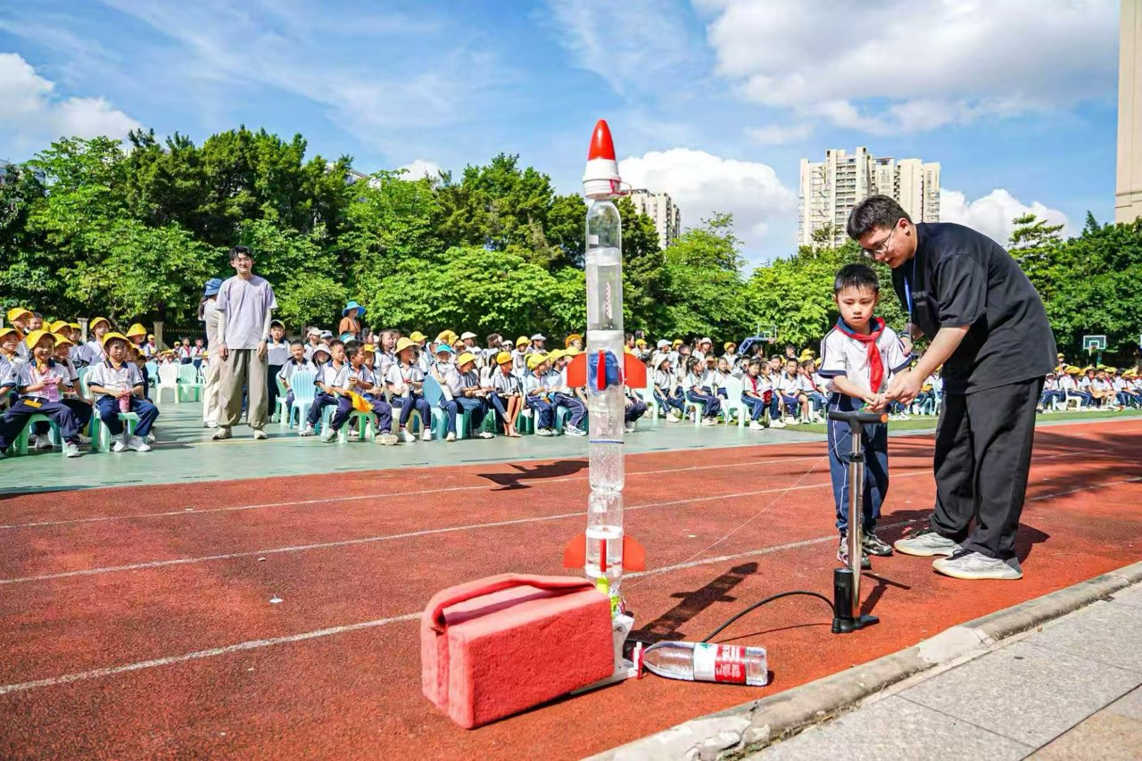 同学们于“迎全运醒狮” 打卡点前合影,并与穿梭校园的醒狮队互动。开学典礼上,学校粤剧社带来粤剧表演。依托海珠区“广东省中小学科学教育实验区”优势,开学典礼现场设有“三级水火箭发射科技体验”活动,师生携手操作发射。