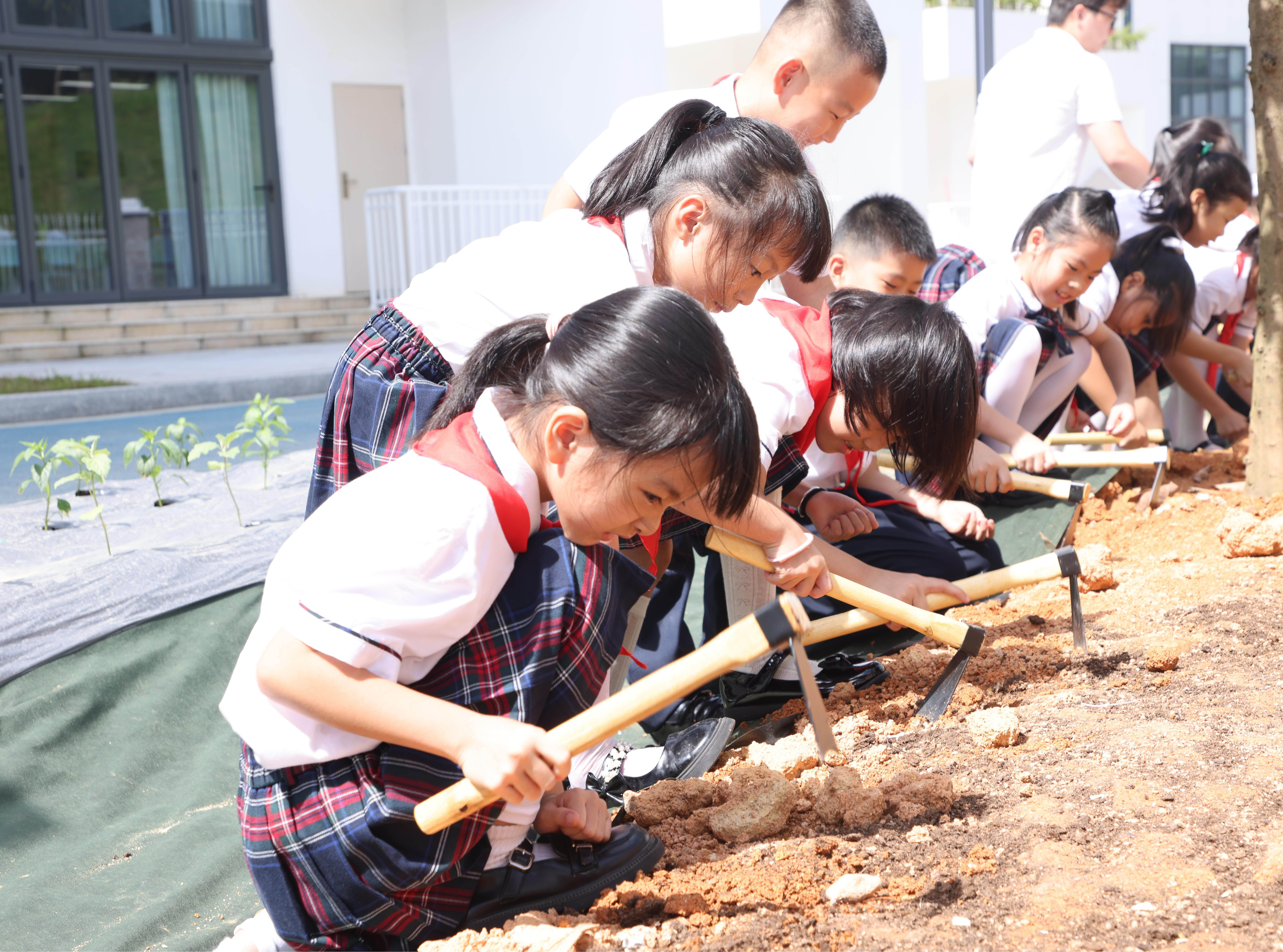 小学部现场,同学们收到了果蔬种植苗作为入学礼物,可在班级种植区播种。
