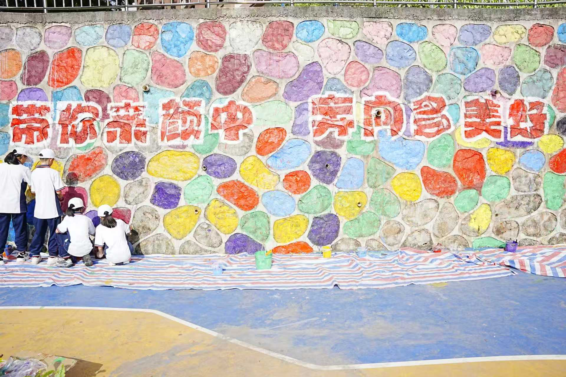 学生在“启始墙”与新校舍“对话”