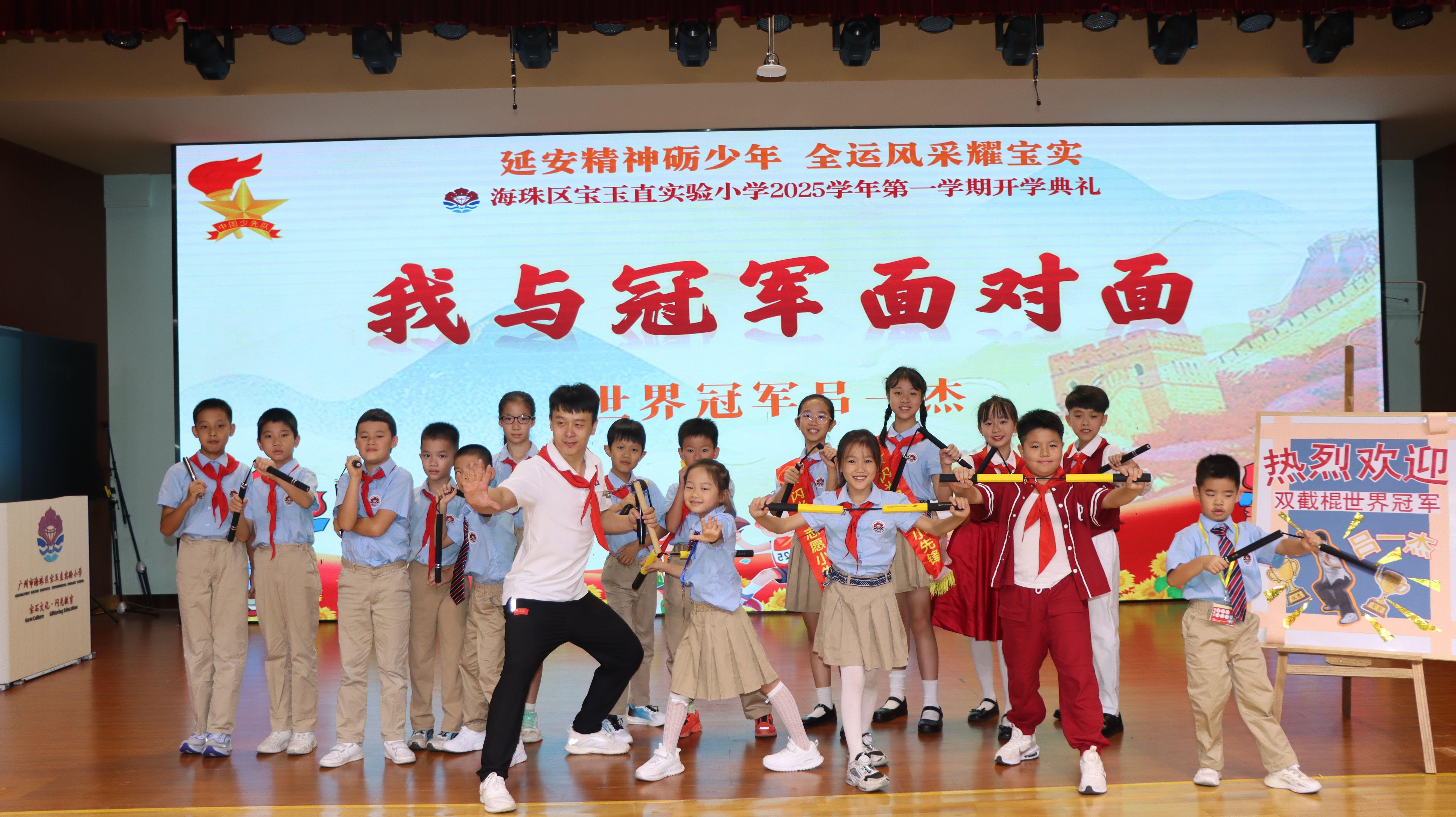 9月1日,广州市海珠区宝玉直实验小学开学典礼以“延安精神砺少年,全运风采耀宝实”为主题,特邀双节棍世界冠军、吉尼斯纪录保持者吕一杰到场。