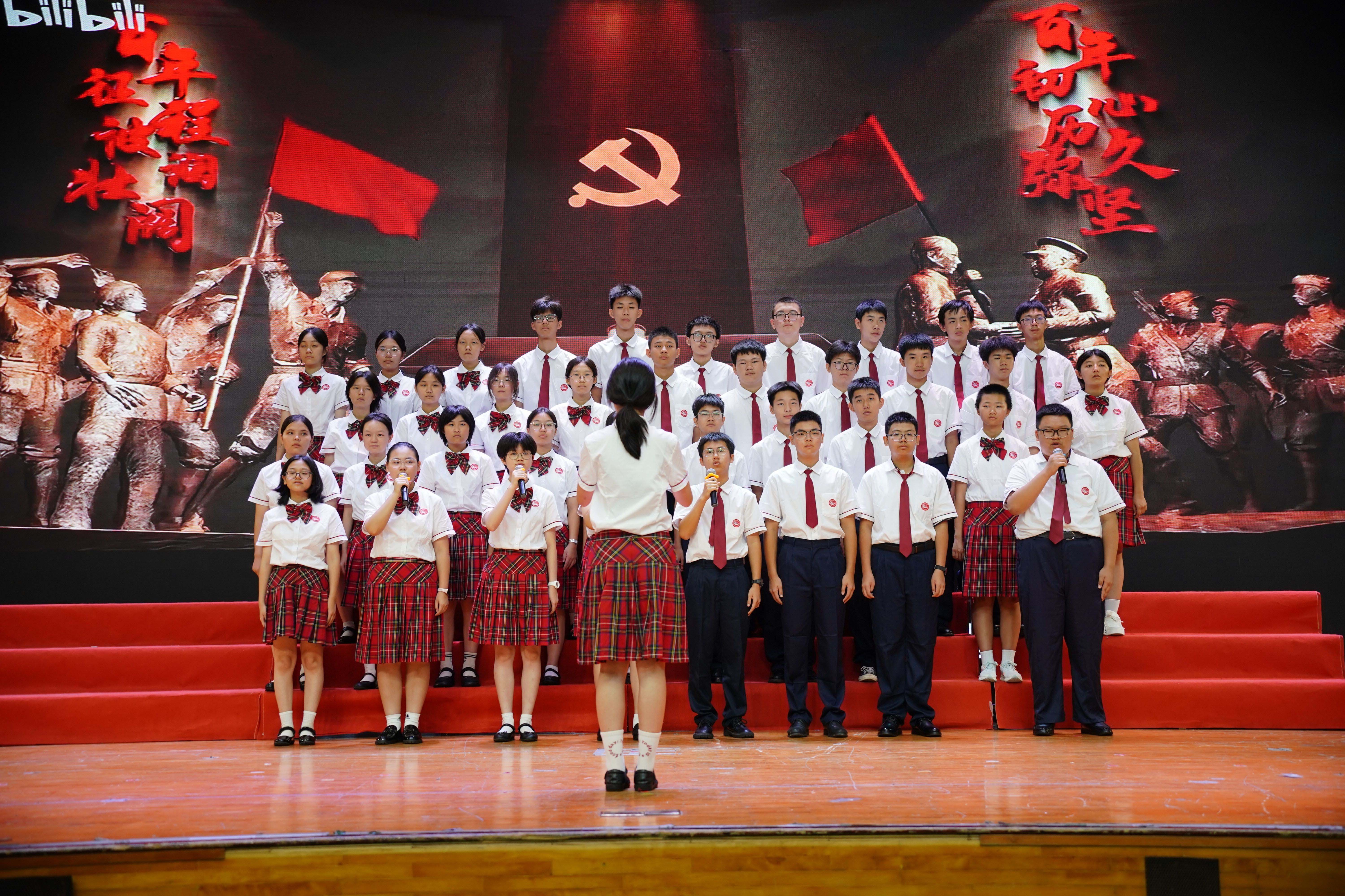 该校初一(2)班、高一(10)班和高一(13)班分别唱响《红星闪闪》《没有共产党,就没有新中国》《信念的力量》。