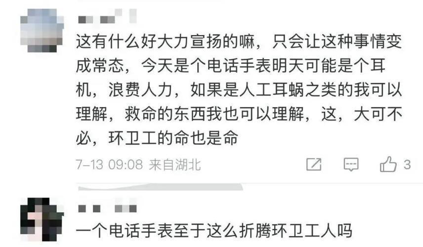 据公开报道,深圳游客卢女士7月1日下午乘坐高铁从太原抵达大同。列车上,孩子将儿童手表装入干净的纸质垃圾袋中玩耍,下车时不慎遗忘在列车上。卢女士拨打热线12345后,大同市新城环境公司将垃圾转运至富乔垃圾焚烧发电场空地,两名环卫工人徒手在垃圾堆中逐一翻找。经过4个多小时,当日16时50分许,丢失的手表从堆积如山的垃圾中被找到,并于当晚送还卢女士手中。大同市新城环境卫生工程有限公司曾在官方公众号上转发了相关消息。消息发出后,却引发网友的质疑,认为“这样的行为有必要吗?”