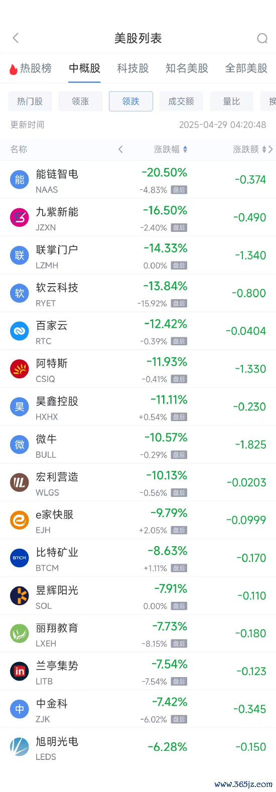领跌中概股列表: