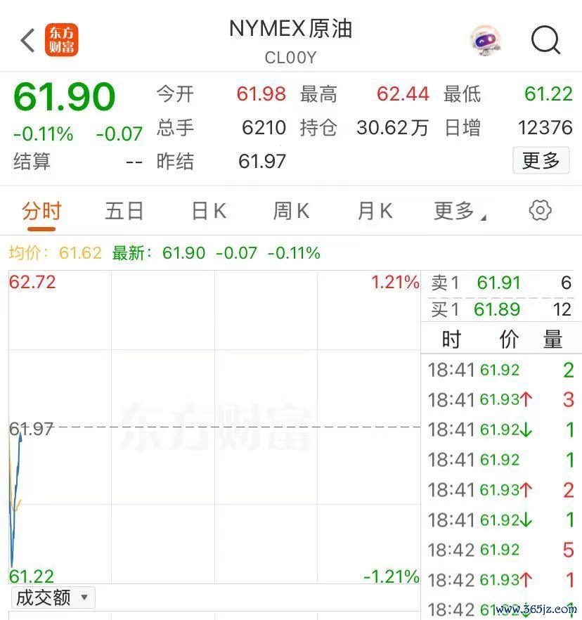 WTI原油期货跌幅一度扩大至1%,报61.30美元/桶。