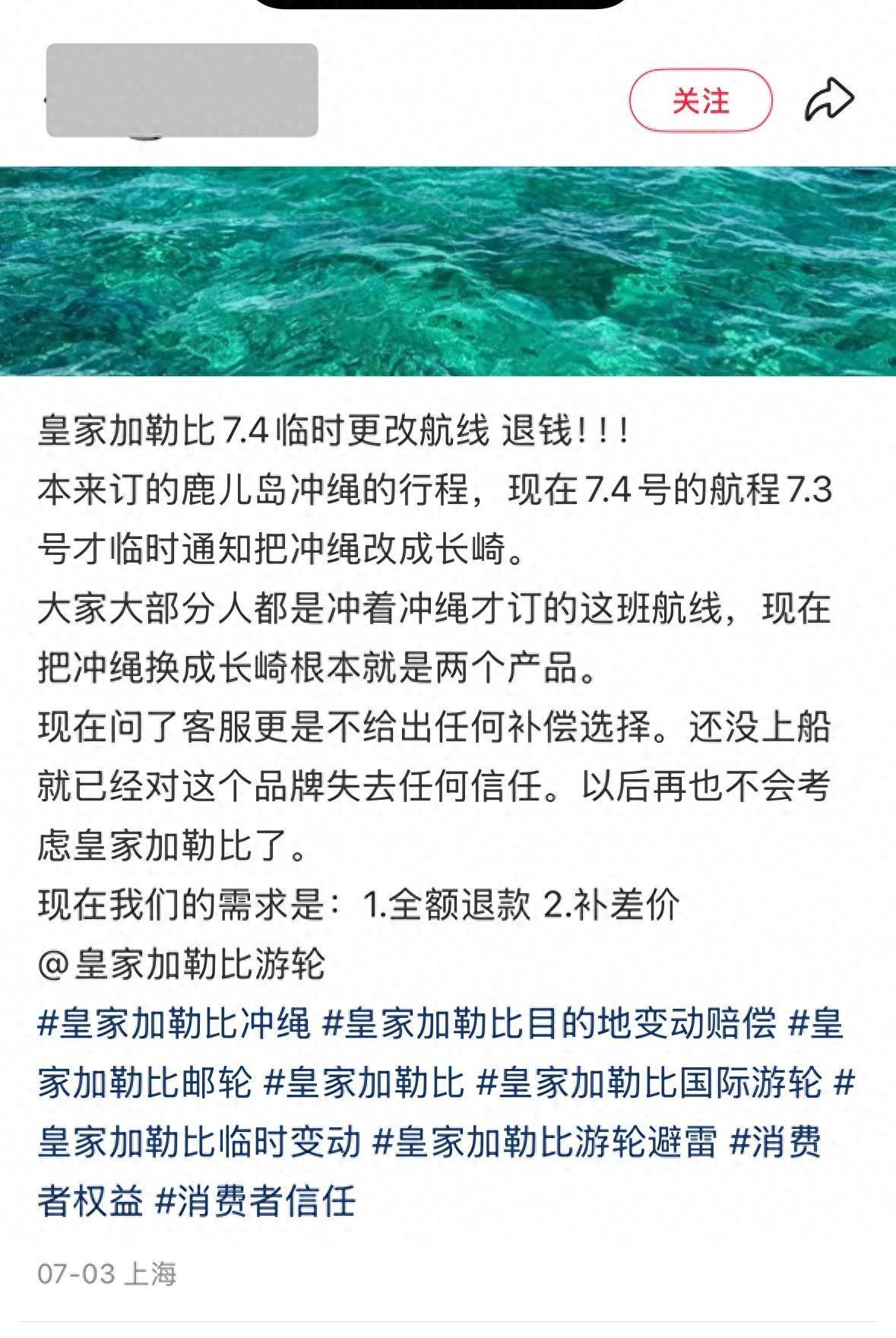 这一调整以及未对游客补偿的行为引发诸多游客的不满,纷纷在社交平台吐槽,呼吁皇家加勒比停止“霸王条款”。 有业内人士对此表示,皇家加勒比此次处理较为简单粗暴,可能会对其品牌声誉带来不利影响。